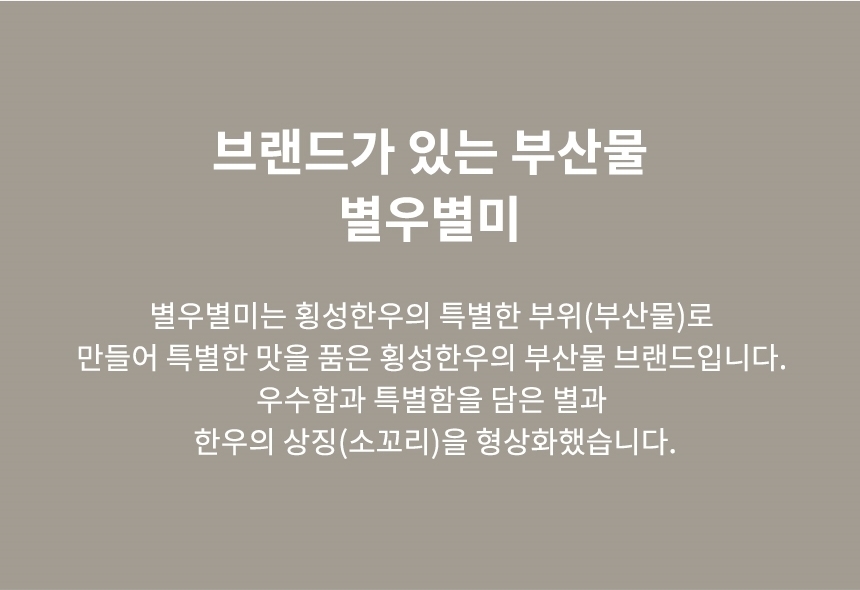 별우별미는 횡성한우의 특별한 부위(부산물)로 만들어 특별한 맛을 품은 횡성한우의 부산물 브랜드[Blend Identity]입니다.